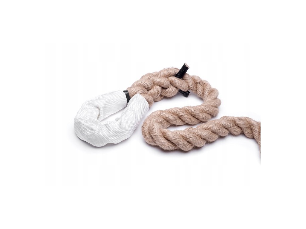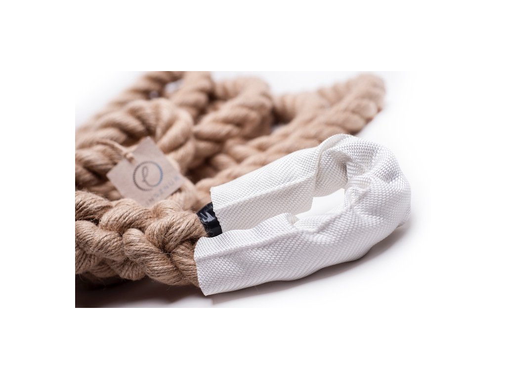 Lano je zakončeno pevně spleteným okem, zajištěným polyamidovým vláknem proti oděru – díky tomu je jeho zavěšení bezpečné a stabilní. Přirozená struktura juty poskytuje skvělou přilnavost, což umožňuje pohodlné a jisté uchopení i při náročném tréninku.