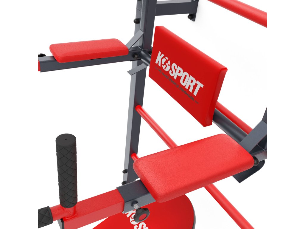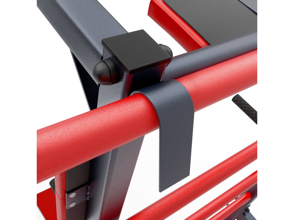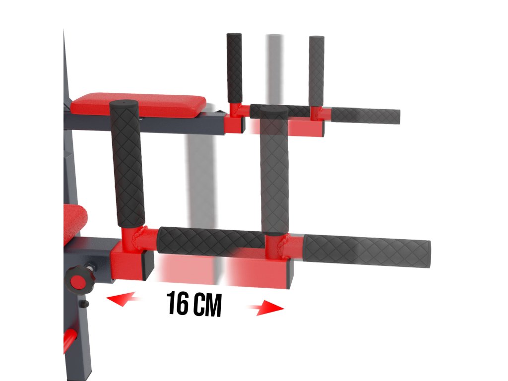 Hrazda s nastavitelnými madly a čalouněným opěradlem umožňuje provádět přesné cviky - kliky na madlech nebo zvedání nohou, které zapojují spodní břišní svaly.