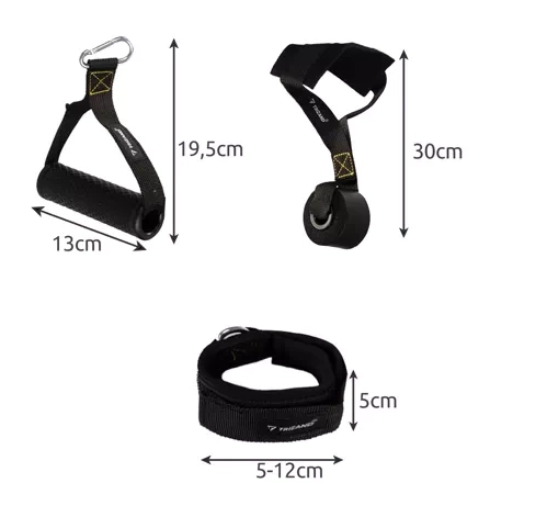 Součástí sady jsou pohodlná pěnová madla, kotníkové popruhy, ocelové karabiny a držák na dveře, který umožňuje snadné a bezpečné uchycení doma i venku. Kovové spoje zaručují pevnost, bezpečnost a rychlou výměnu komponentů.