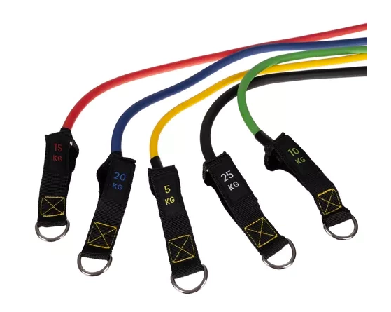 5 pásů s různým odporem: 5 kg, 10 kg, 15 kg, 20 kg, 25 kg