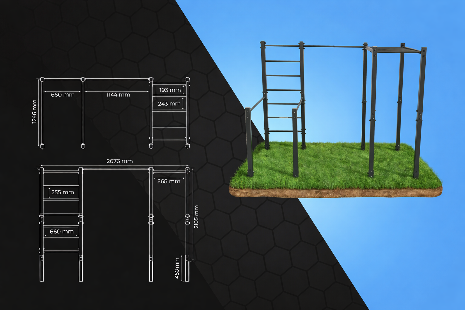 Horizontální žebřiny rozšiřují možnosti o cvičení ve visu. Rozestupy příček jsou navrženy tak, aby bylo možné bezpečně seskočit z jakékoli pozice, což výrazně zvyšuje komfort i bezpečnost.