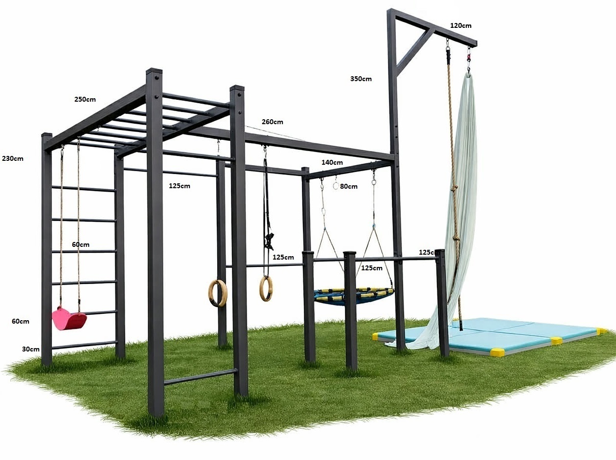 Houpačka, gymnastické kruhy a další příslušenství nejsou součástí sestavy.