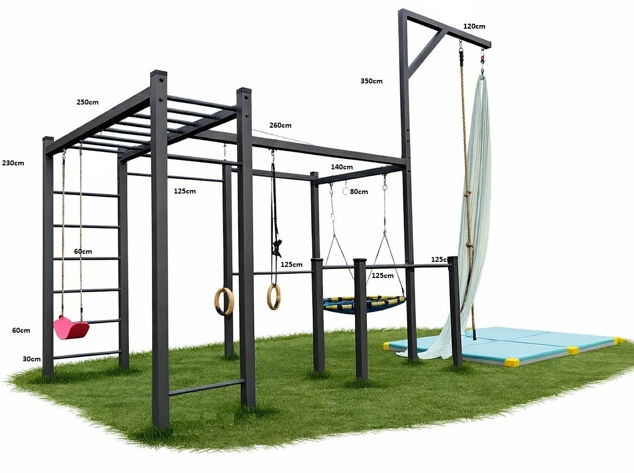 Sestava je vhodná jak pro domácí zahrady, tak pro veřejná venkovní hřiště, školy či sportovní areály. Kombinuje funkčnost, bezpečnost a moderní vzhled, který zapadne do každého prostředí.