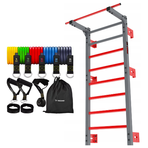 Žebřiny s hrazdou a posilovací gumy - Zider Profi červeno šedá kombinace