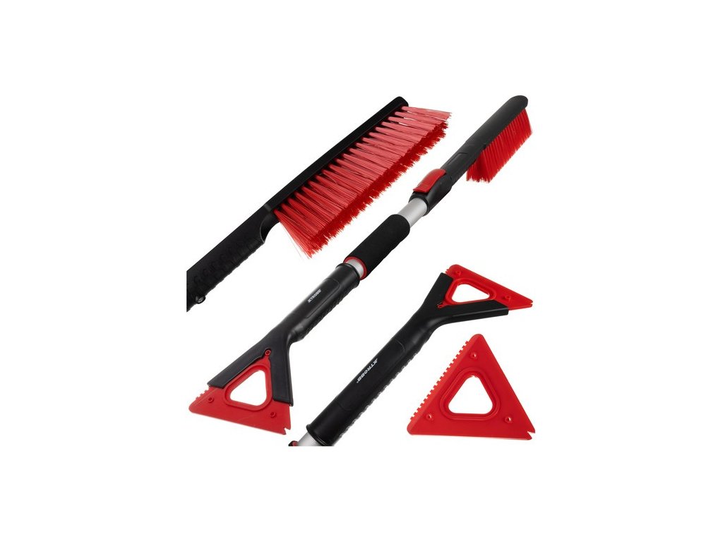 Teleskopická PREMIUM škrabka s kartáčem je ideálním doplňkem pro kompletní zimní údržbu vozu. Nastavitelná délka rukojeti od 86 do 103 cm umožňuje pohodlné odstranění sněhu ze střechy i hůře dostupných míst. Pevný zámek teleskopu zajišťuje stabilitu i při větším tlaku na zmrzlý sníh. Třífunkční škrabka si poradí se slabou námrazou, silnou vrstvou ledu i čištěním stěračů. Měkké štětiny kartáče jsou šetrné k laku a ergonomická rukojeť s EVA pěnou chrání ruce před chladem a zajišťuje pevný, neklouzavý úchop. Škrabku lze navíc odejmout a použít samostatně na menší plochy nebo boční okna.